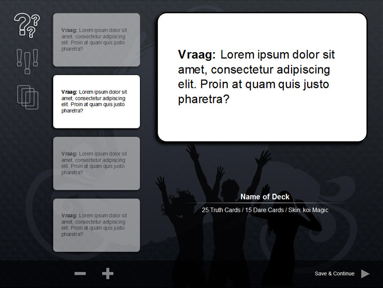 Voorwaarde is wel dat je de vragen en opdrachten kunt voorbereiden, hiermee zorg je dat het spel binnen de gewenste kaders blijft en de vragen en opdrachten geschikt zijn voor de gelegenheid en de doelgroep. Het zelf aanmaken van een spel is dan ook een belangrijke functie binnen deze game, daarnaast zijn er ook een aantal kant-en -klare “thema decks” zodat je direct kunt spelen.