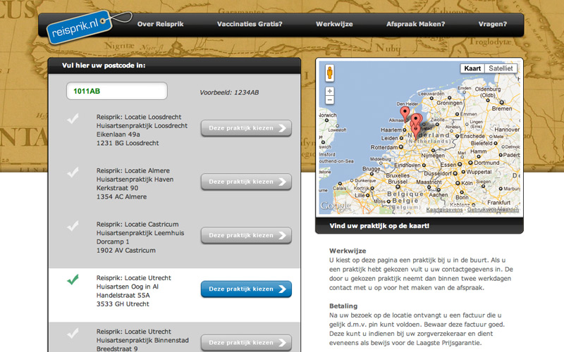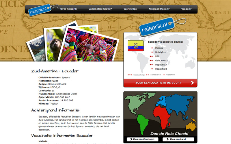 De belangrijkste doelstelling van de Reisprik.nl website is de bezoeker te voorzien van vaccinatie-informatie omtrent een geplande reis en hem/haar vervolgens via de “locatie dichtbij” zoekfunctie te verleiden tot het maken van een afspraak. Omdat vaccineren deel uitmaakt van de reisvoorbereiding is gekozen voor een visuele ervaring die aansluit bij reizen. Dit positieve gevoel verbloemt als het ware de medische handeling die sommige mensen als vervelend kunnen ervaren.