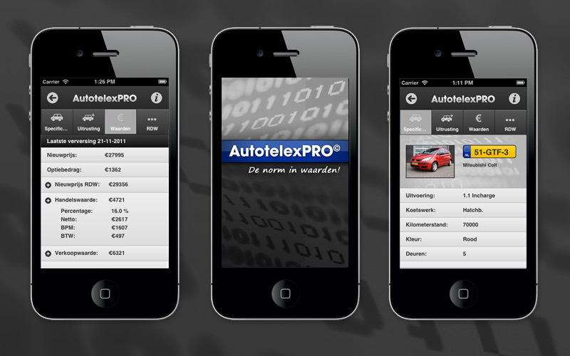 Het brengen van de AutotelexPro functionaliteit, voertuigidentificatie en waardebepaling, naar het mobiele platform (iPhone & Android Smartphones) voor AutotelexPRO abonnees. De App moet visueel aansluiten bij het nieuwe design van de website en aanverwante producten. Daarnaast is er een sterke focus op eenvoud in gebruik en een logische opbouw van data.