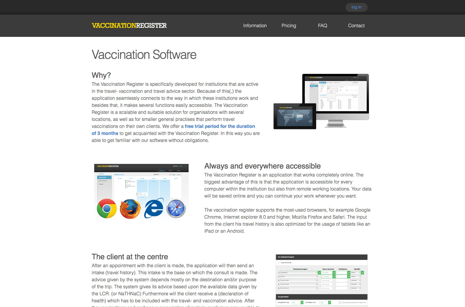 Het Vaccinatieregister is specifiek ontwikkeld voor instellingen die actief zijn in de reis- vaccinatie en reisadvies branche. Het pakket sluit hierdoor naadloos aan bij de werkwijze van deze instellingen en maakt de diverse functies op eenvoudige wijze toegankelijk. Het Vaccinatieregister is niet alleen schaalbaar en geschikt voor organisaties met meerdere locaties, maar ook voor kleinere huisartsenpraktijken die reisvaccinaties uitvoeren voor hun eigen patiënten.